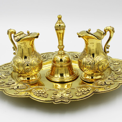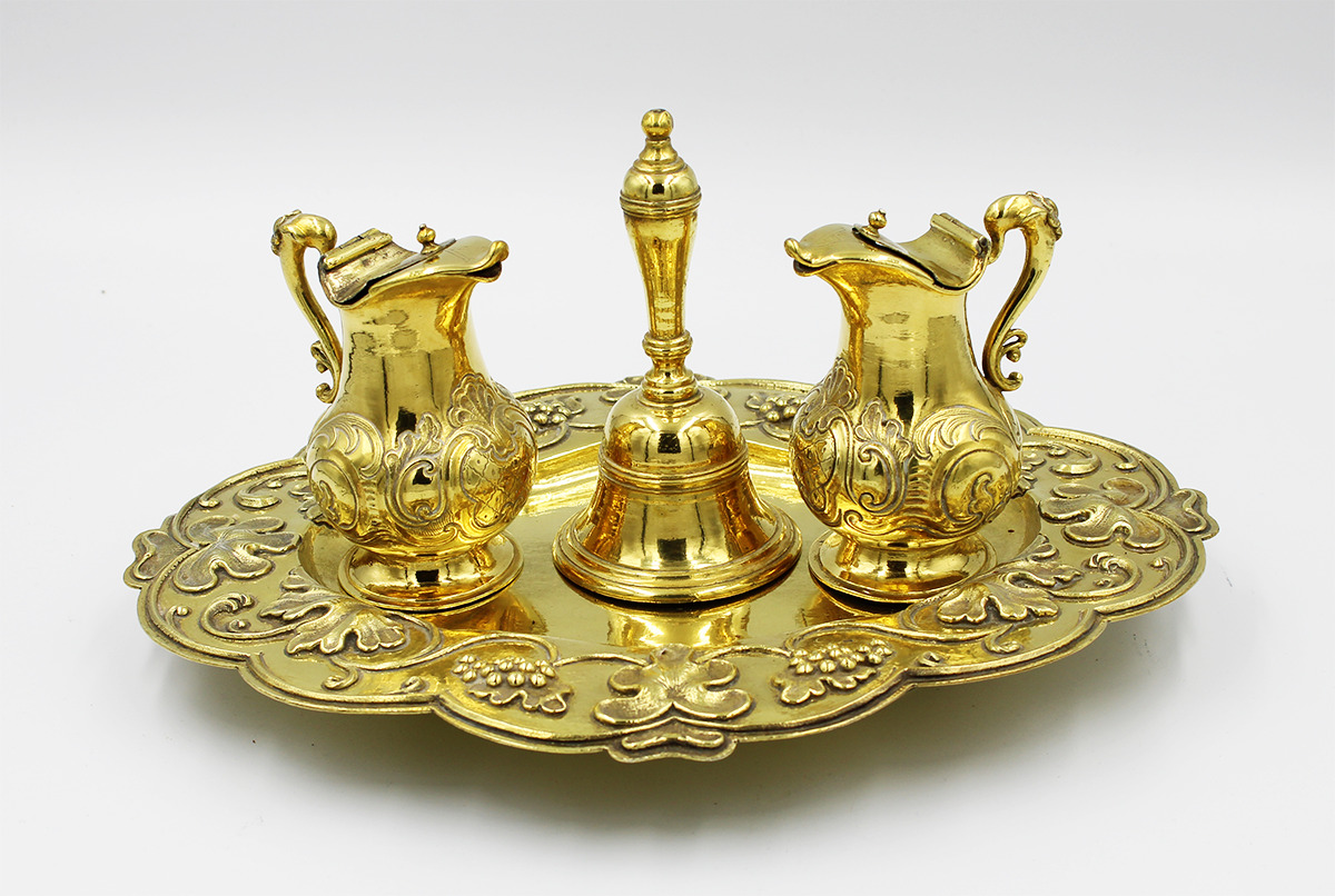 - es Conjunto formado por dos dos vinajeras, campanilla y bandeja en plata sobredorada de estilo barroco.