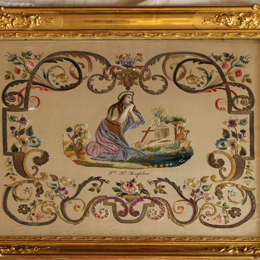 Embroidered in different colored threads depicting the penitent Mary Magdalene. The saint is located in the center, surrounded by a border of geometric and floral motifs.