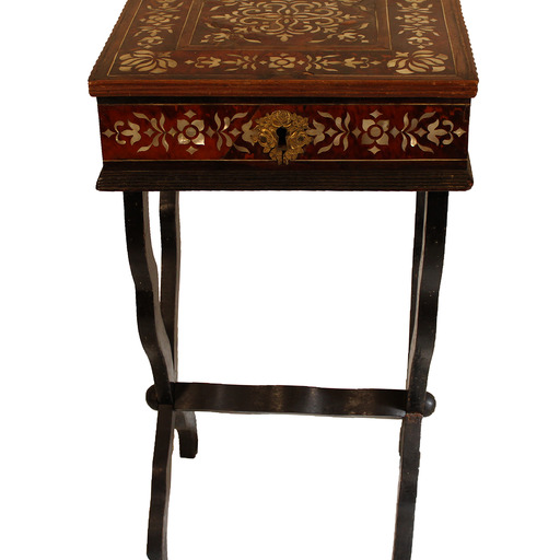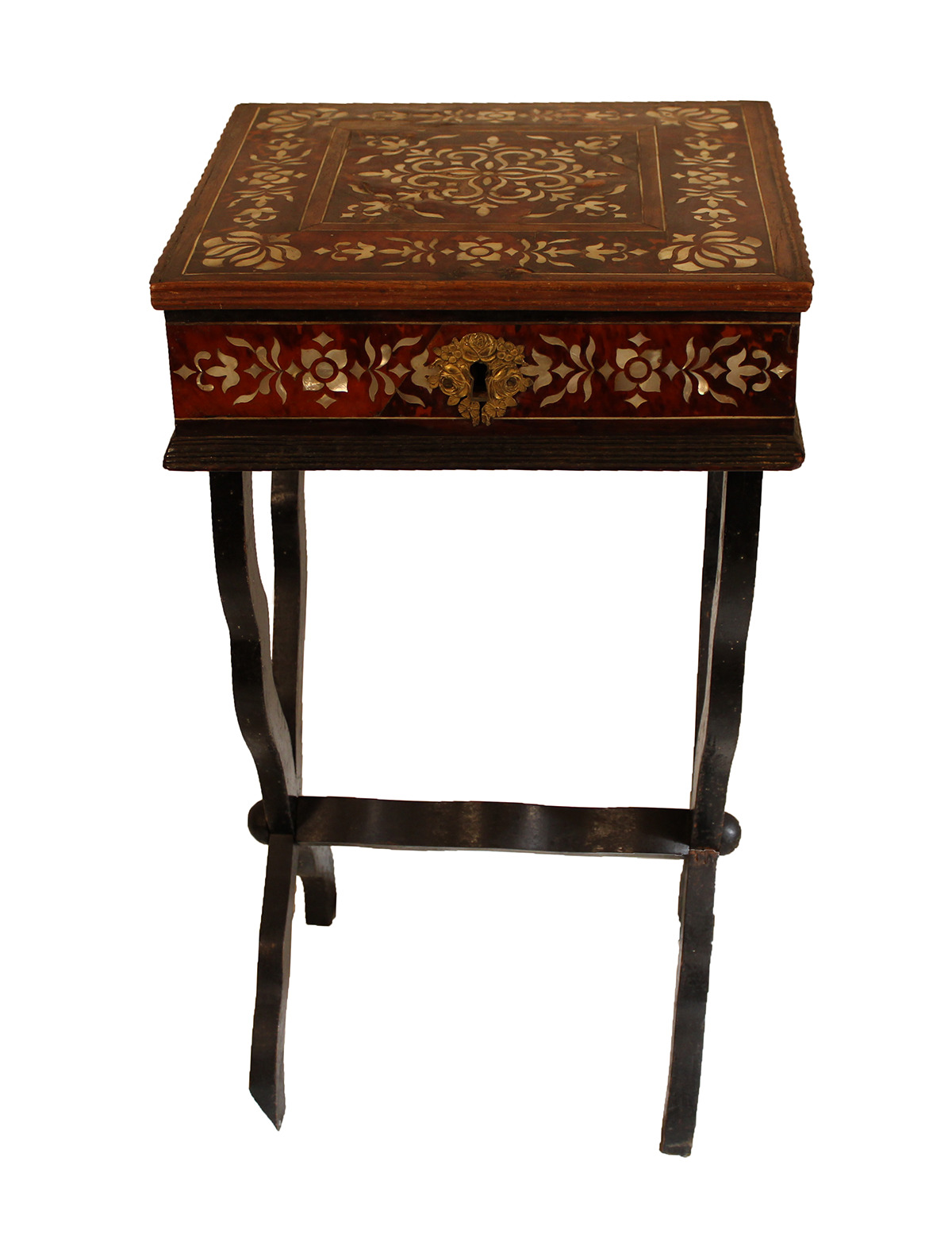 - en Wooden sewing box decorated with tortoiseshell and mother-of-pearl marquetry. Scissor legs and interior upholstered in floral-patterned fabric.