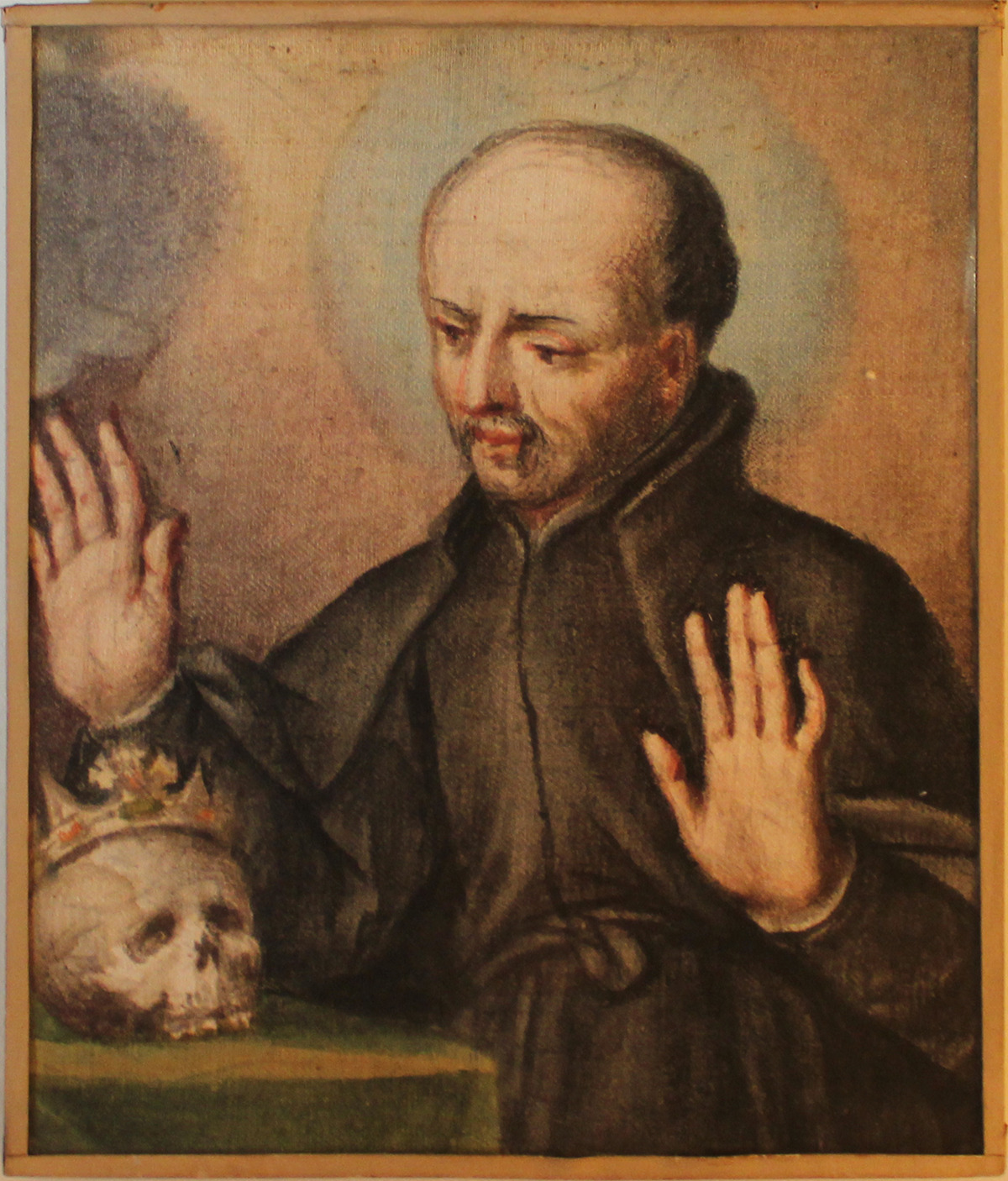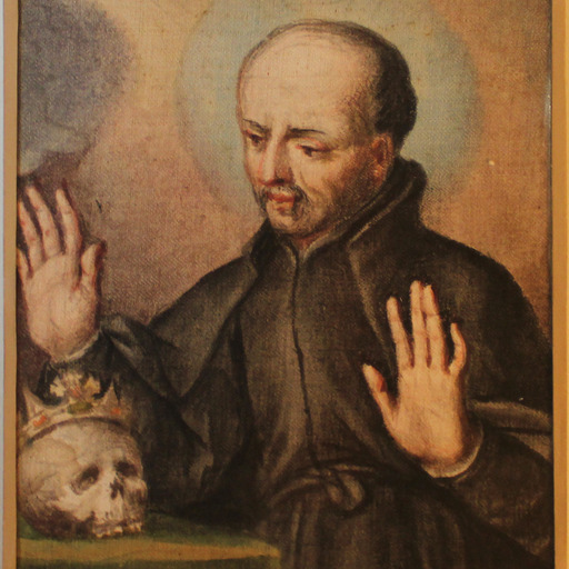 Common representation of Saint Francis Borgia. He is shown renouncing his ducal dignity in favor of the Faith. The saint looks toward a crowned skull, a symbol of the ephemeral grandeurs of the world that must be renounced.