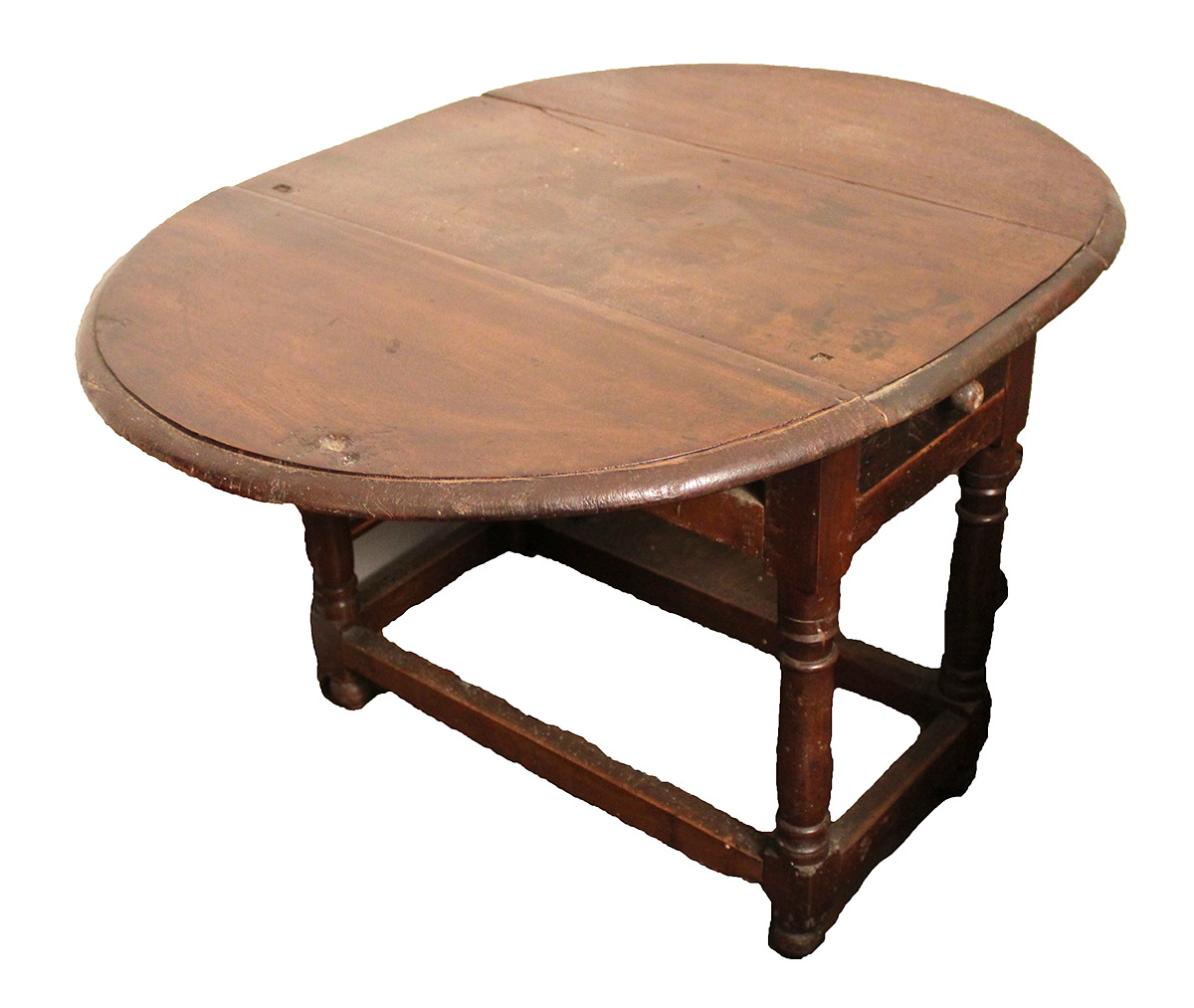 Mesa con alas extensibles y cuatro patas unidas entre sí por largueros. Tiene unos tiradores que sujetan los dos tableros a los costados que forman parte de la extensión de la mesa y un cajón.