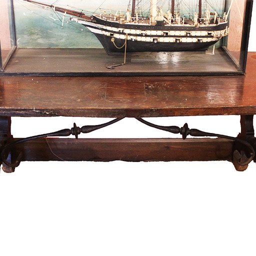A popular example of a table with lyre legs that was introduced to Spain and France from Italy. It has a slightly curved edge, cut-out supports, and S-shaped fasteners.